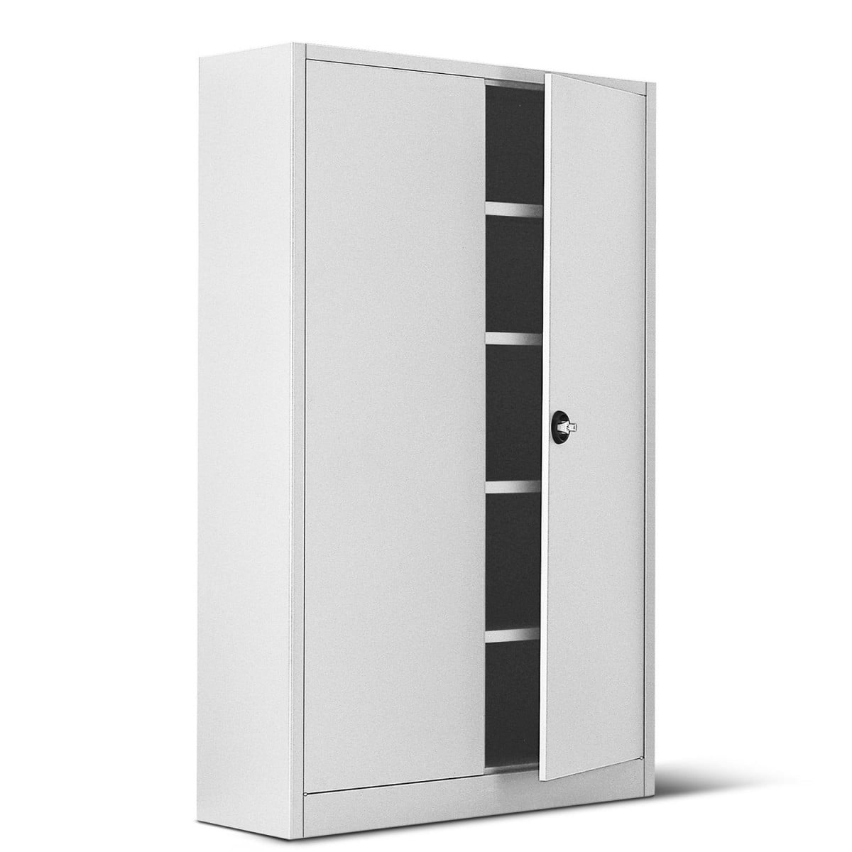 Armadio metallico bianco ad ante a battente. Dotato di 4 ripiani regolabili in altezza e serratura.